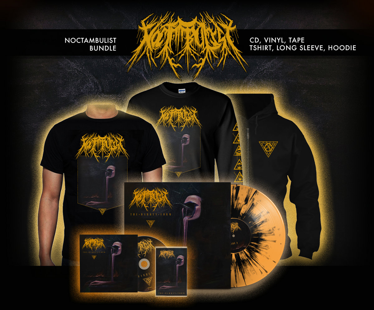 All merch available for the new Noctambulist album combined in one package saving you a few dollars and rewarding you for buying everything. In this package you get it all the CD and limited Orange with Black Splatter LP, Cassette, and the Tshirt, LS, and hoodie.